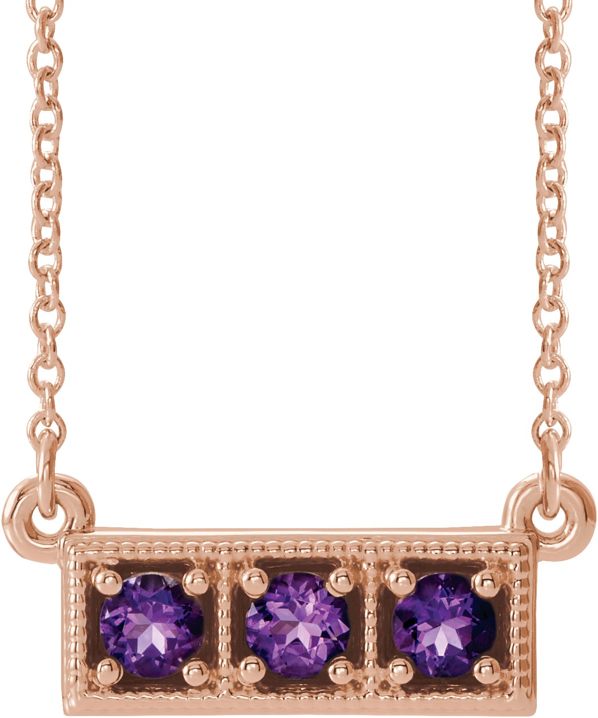 14K Rose Amethyst Three Stone Granulated Bar 16 18" Necklace Ref. 14204217