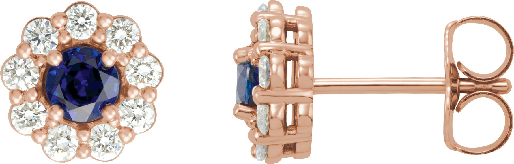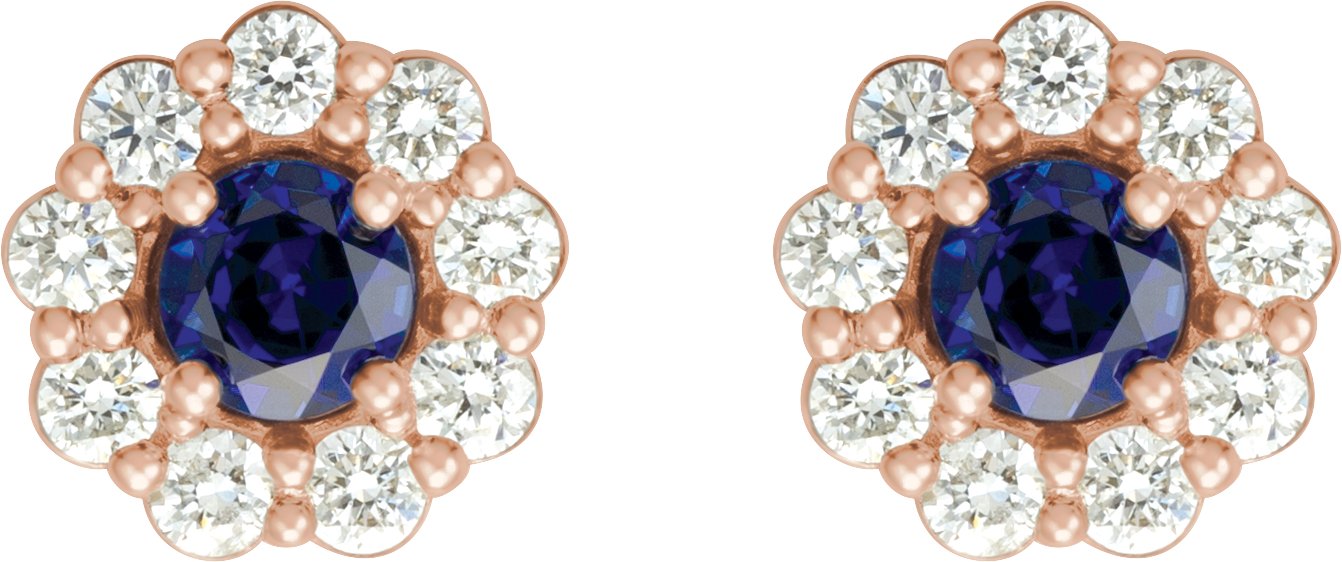 14K Rose Chatham Created Blue Sapphire and .375 CTW Diamond Halo Style Earrings