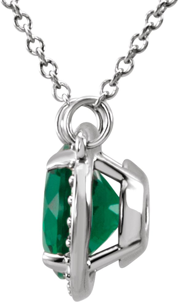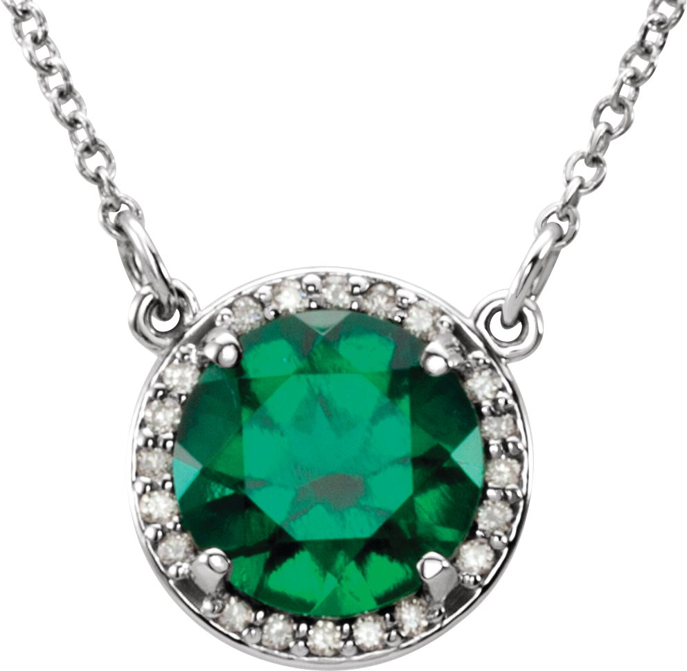 14K White 7 mm Round Chatham Created Emerald and .04 CTW Diamond 16 inch Necklace