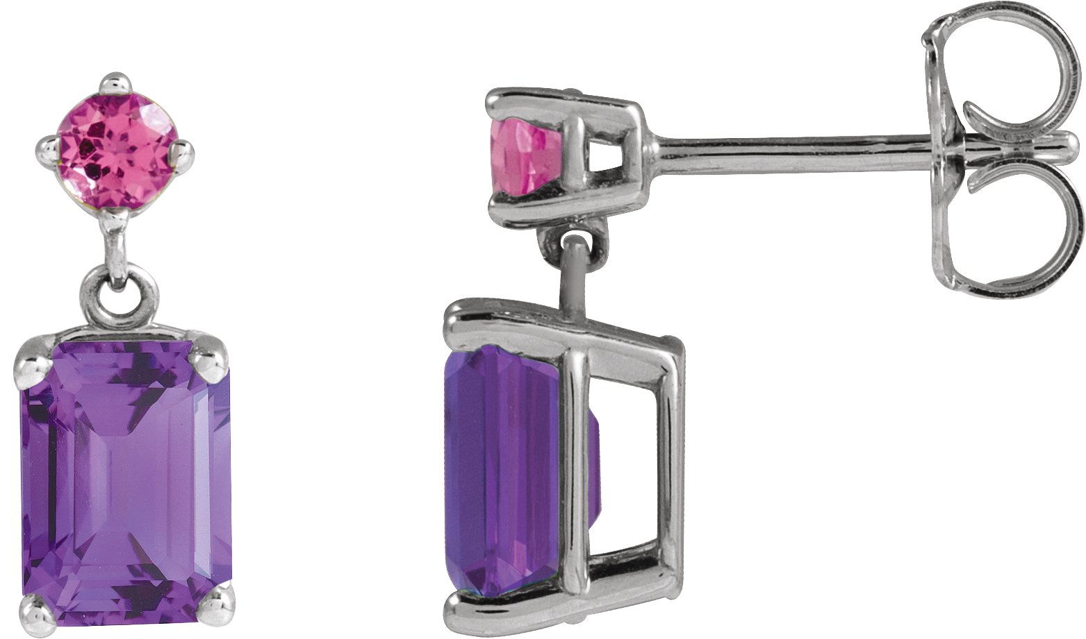 14K White Natural Amethyst & Natural Pink Tourmaline Dangle Earrings
