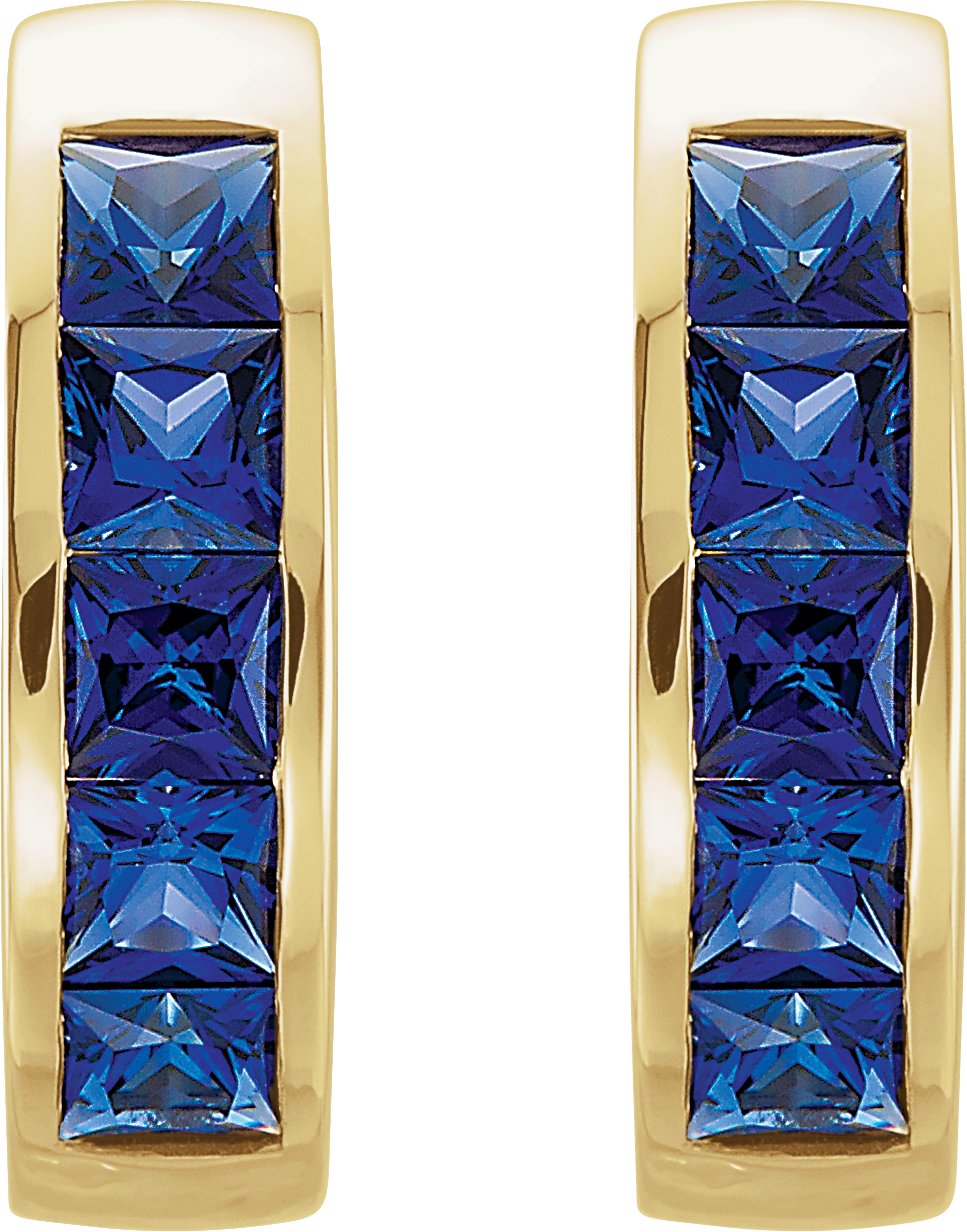 14K Yellow Chatham Created Blue Sapphire Hoop Earrings
