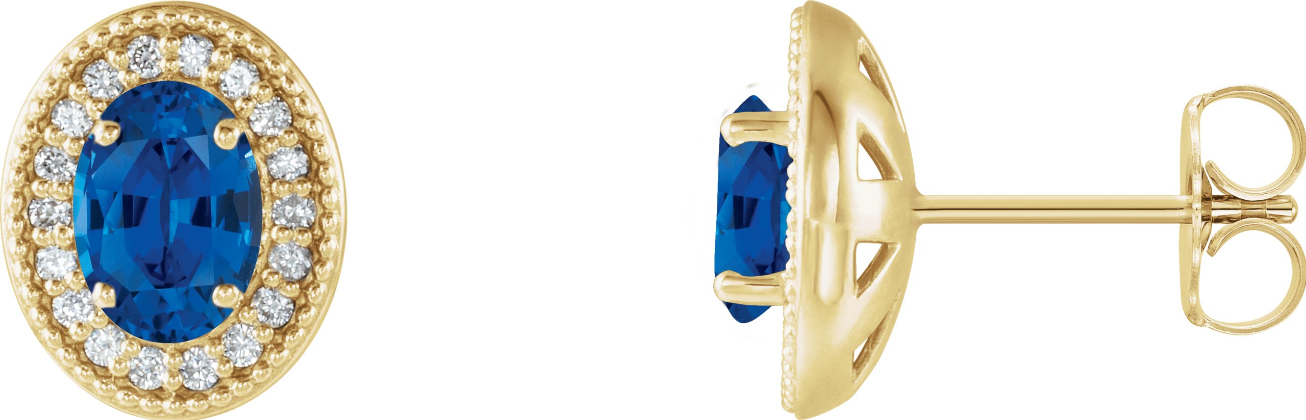 14K Yellow Chatham Created Blue Sapphire & 1/5 CTW Diamond Halo Style Earrings