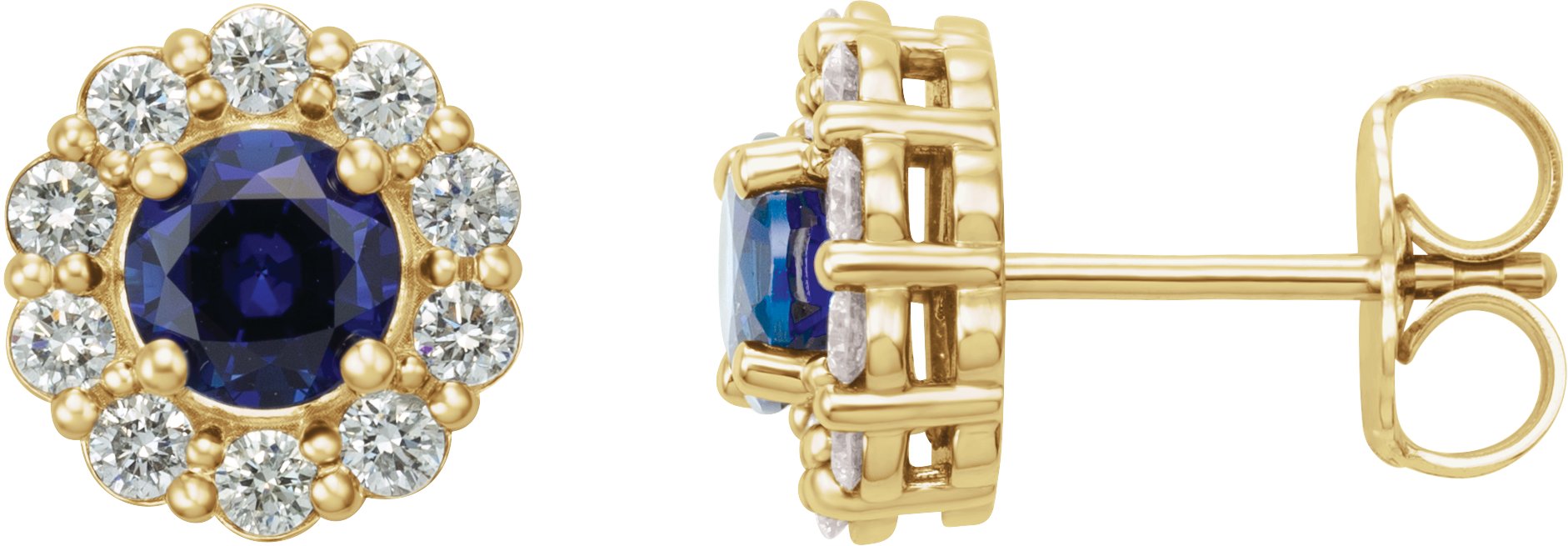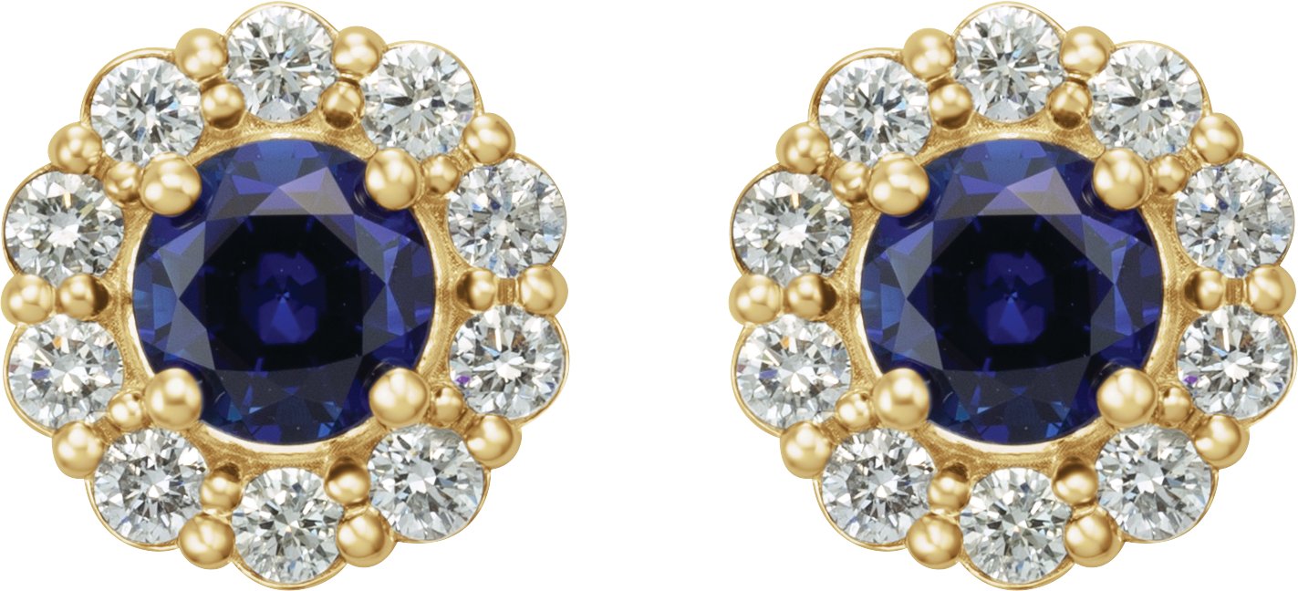 14K Yellow Chatham Created Blue Sapphire and .50 CTW Diamond Halo Style Earrings