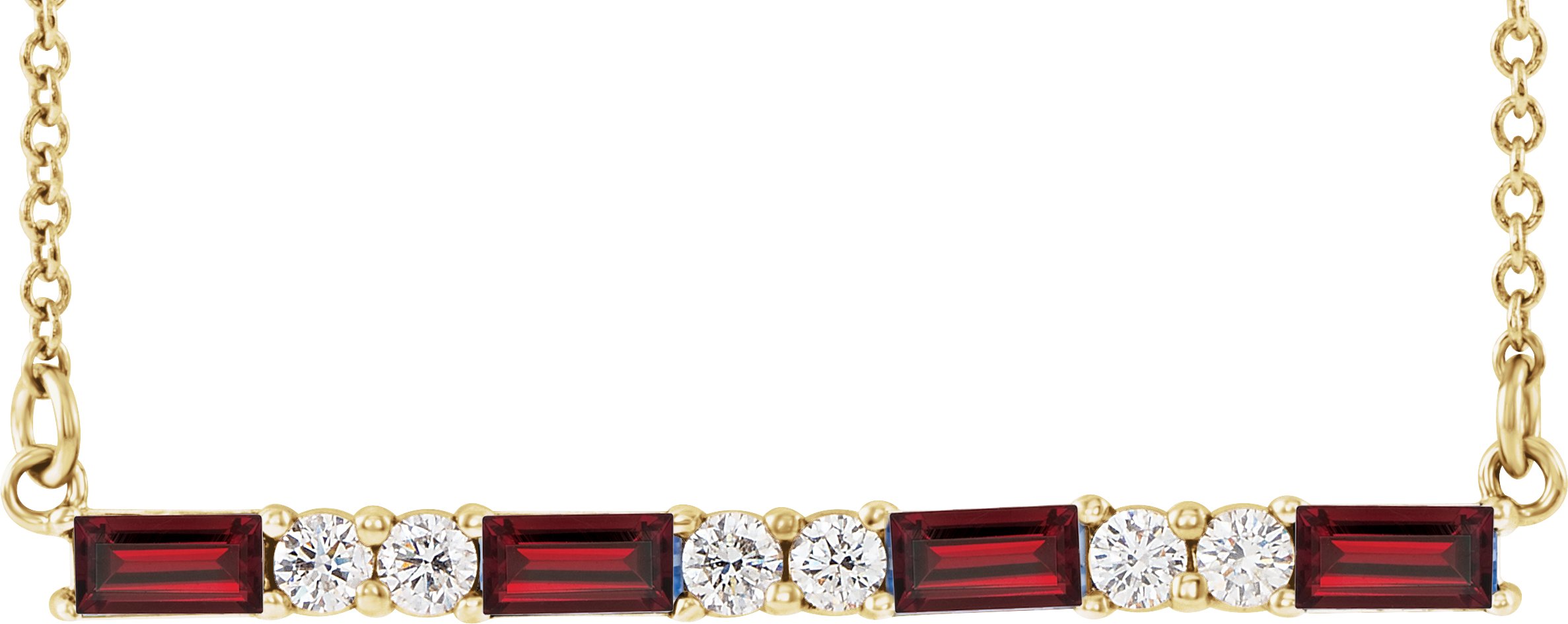 Description: Genuine Garnet And 1/5 Ctw Diamond Bar Necklace