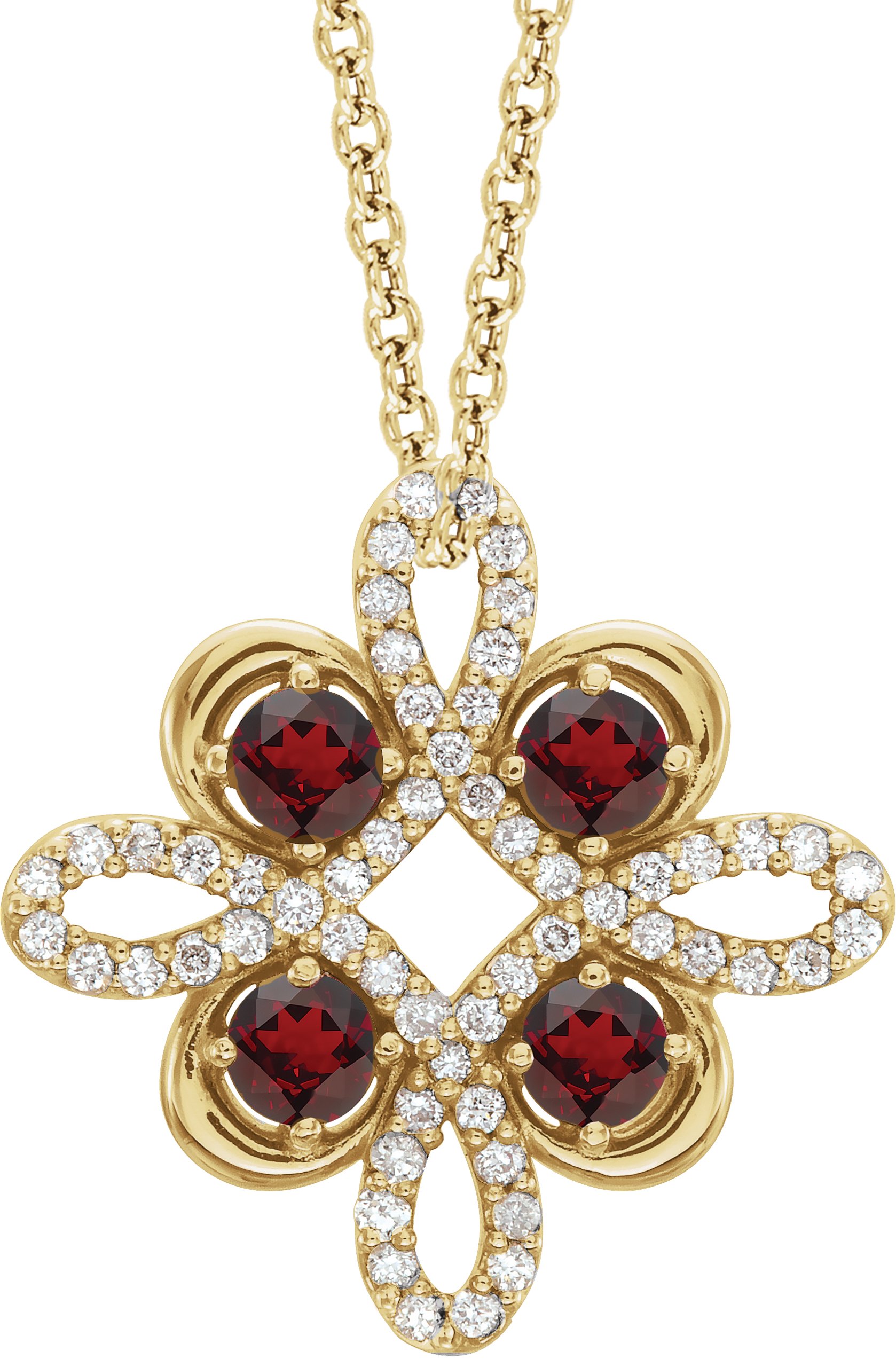 14K Yellow Mozambique Garnet and .17 CTW Diamond Clover 18 inch Necklace