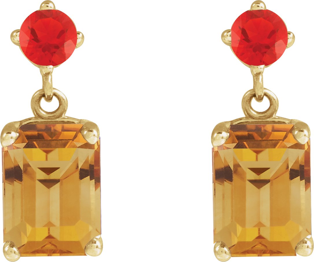 14K Yellow Natural Citrine & Natural Mexican Fire Opal Dangle Earrings