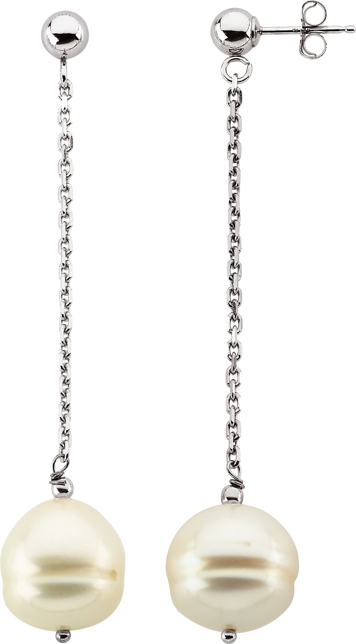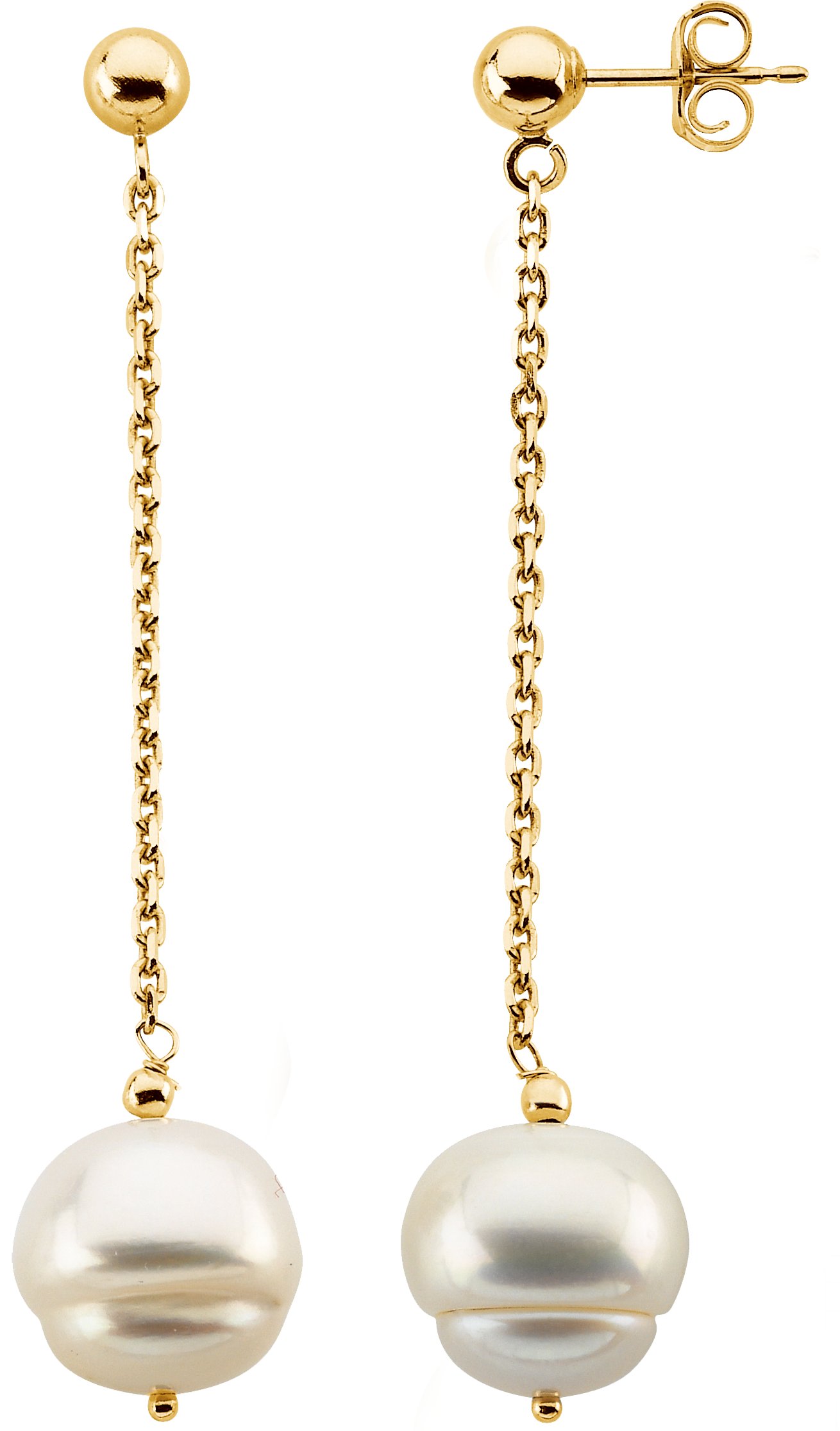 Freshwater Circle Pearl Chain Dangle Earrings | 9 - 11 mm. Available in 14K Yellow or 14K White Gold. Each earring features a white, freshwater cultured, circle pearl.