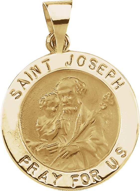 Hollow Round St. Joseph Medal | 18.25 mm. St. Joseph is the patron saint of carpenters, workers, the dying, universal church, China and Peru. Available in 14K Yellow or 14K White Gold.