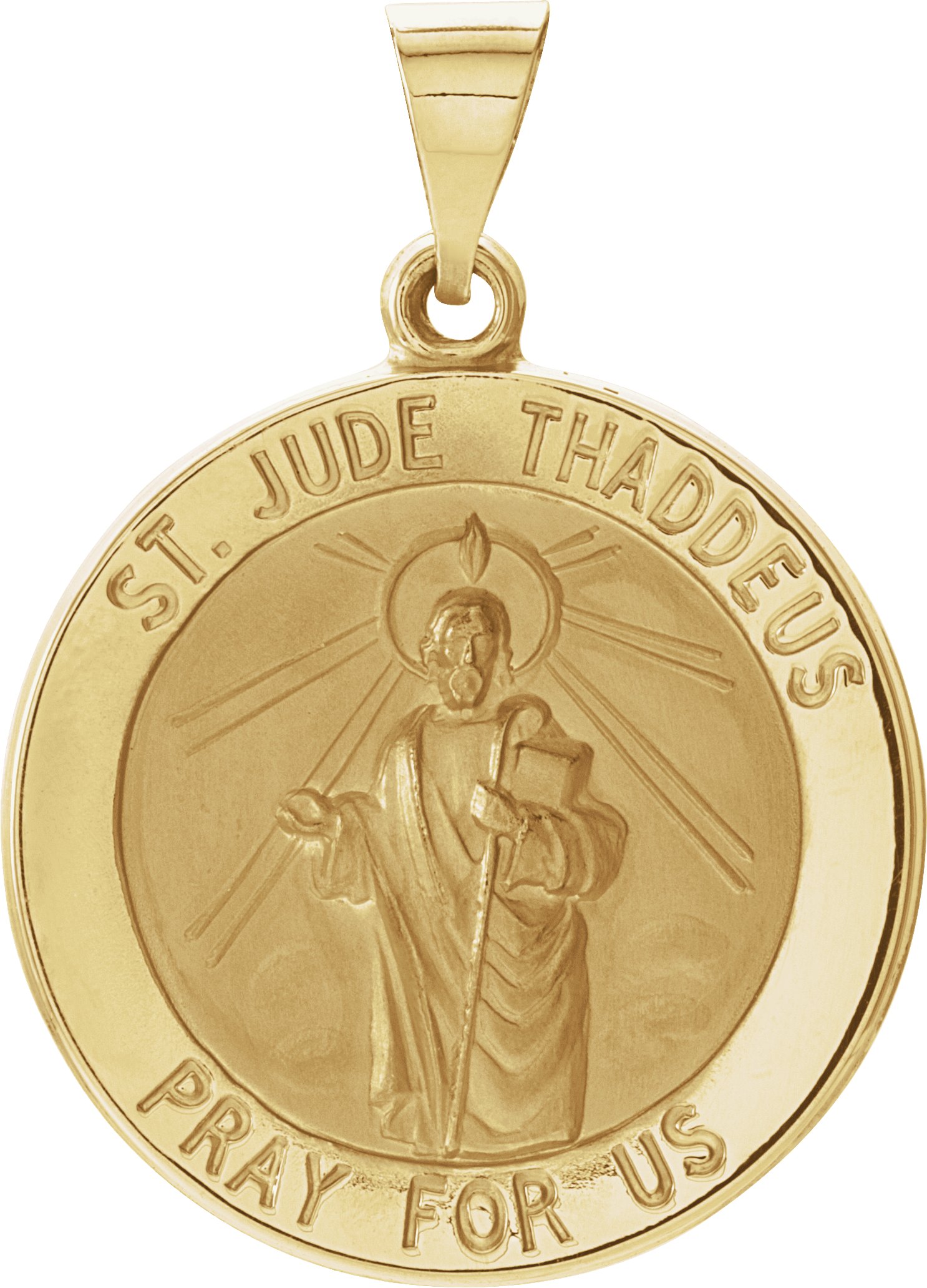 Hollow Round St. Jude Medal | 18.25 mm. St. Jude is the patron saint of elderly maids, desperate situations and hospitals. Available in 14K Yellow or 14K White Gold.