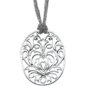 Oblong Filigree Pendant 39.5x32 mm. No bail. Can be hung from a cord or chain using a cow-hitch assembly. Available in 14K Yellow or 14K White Gold. Pendant shown on Chain CH766 which is sold separately.