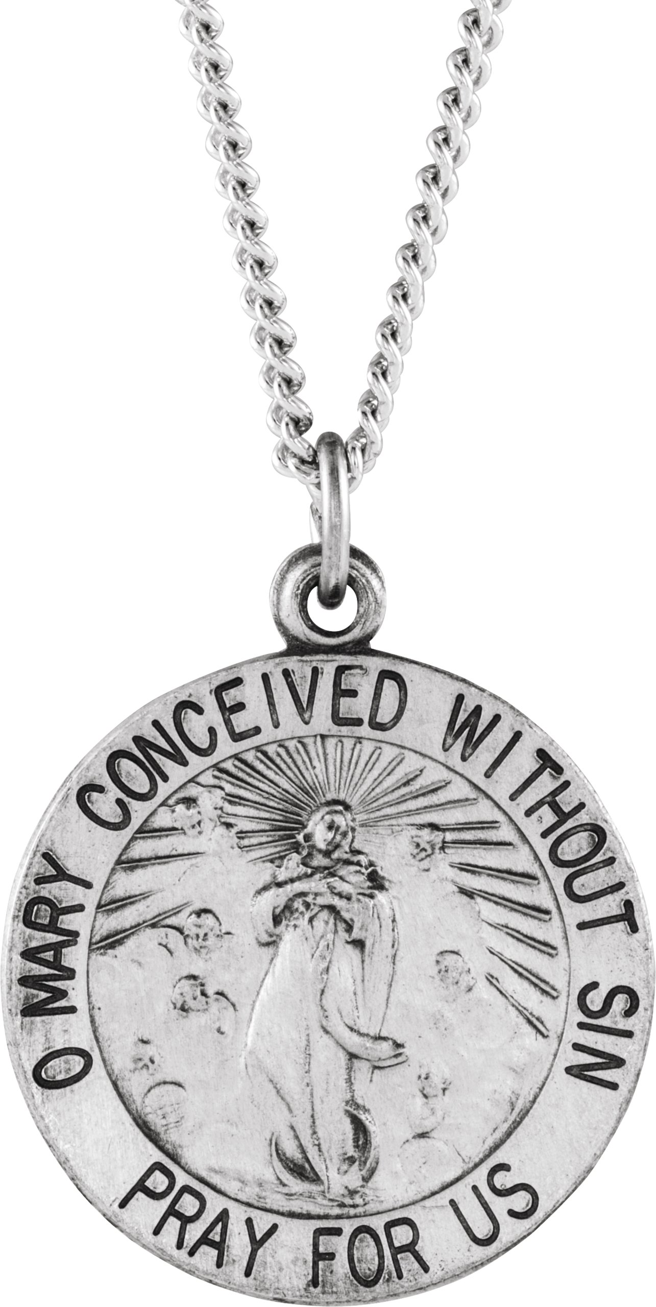 Round Immaculate Conception Medal | 15 mm. Sterling Silver. The Immaculate Conception is the patroness of Brazil and the United States.