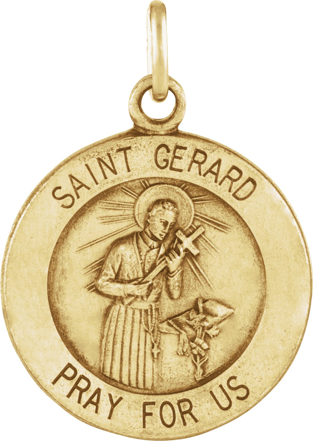 Round St. Gerard Medal | 15 mm. Available in 14K Yellow or 14K White Gold. St. Gerard is the patron saint of expectant mothers.
