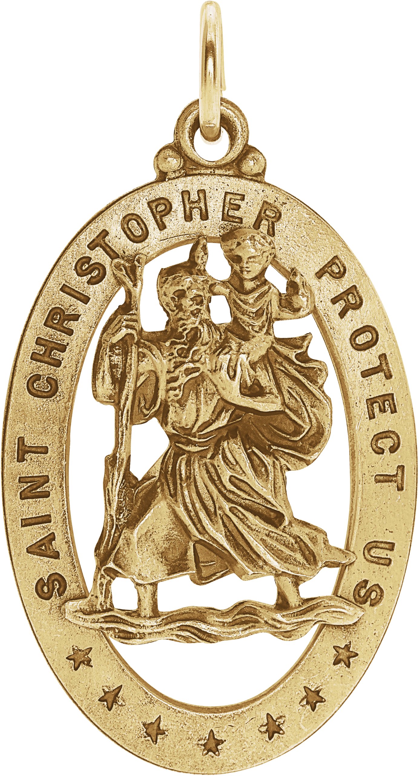 St. Christopher Medal | 25 x 18 mm. St. Christopher is the patron saint of athletes, porters, sailors and travelers. Available in 14K Yellow or 14K White Gold.