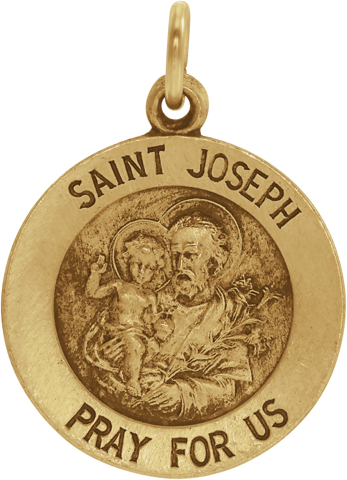 St. Joseph Medal | 15 mm. St. Joseph is the patron saint of carpenters, workers, the dying, universal church, China and Peru. Available in 14K Yellow or 14K White Gold.