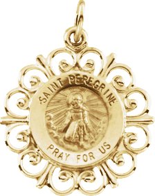 St. Peregrine Medal | 18.5 mm. 14K Yellow Gold. St. Peregrine is the patron saint of cancer patients.
