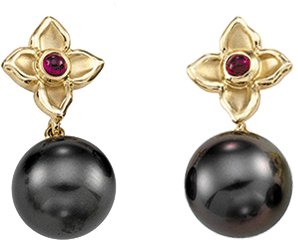 Tahitian Cultured Pearl and Genuine Ruby Flower Earrings 12mm Ref 235238