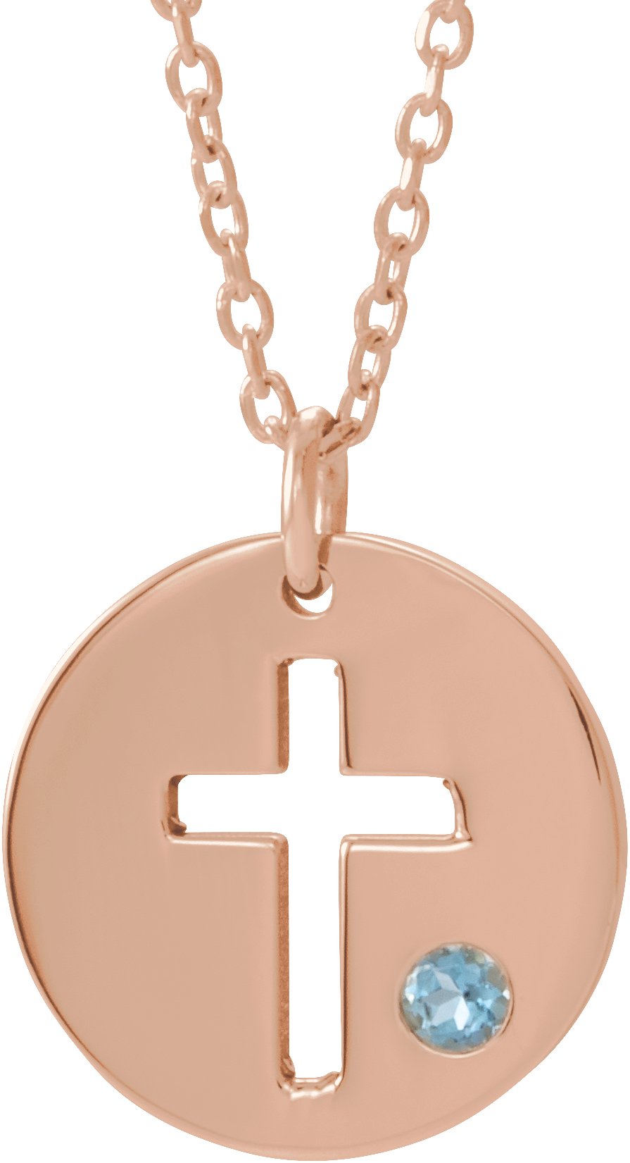 14K Rose Aquamarine Pierced Cross Disc 16 18" Necklace Ref. 13377627