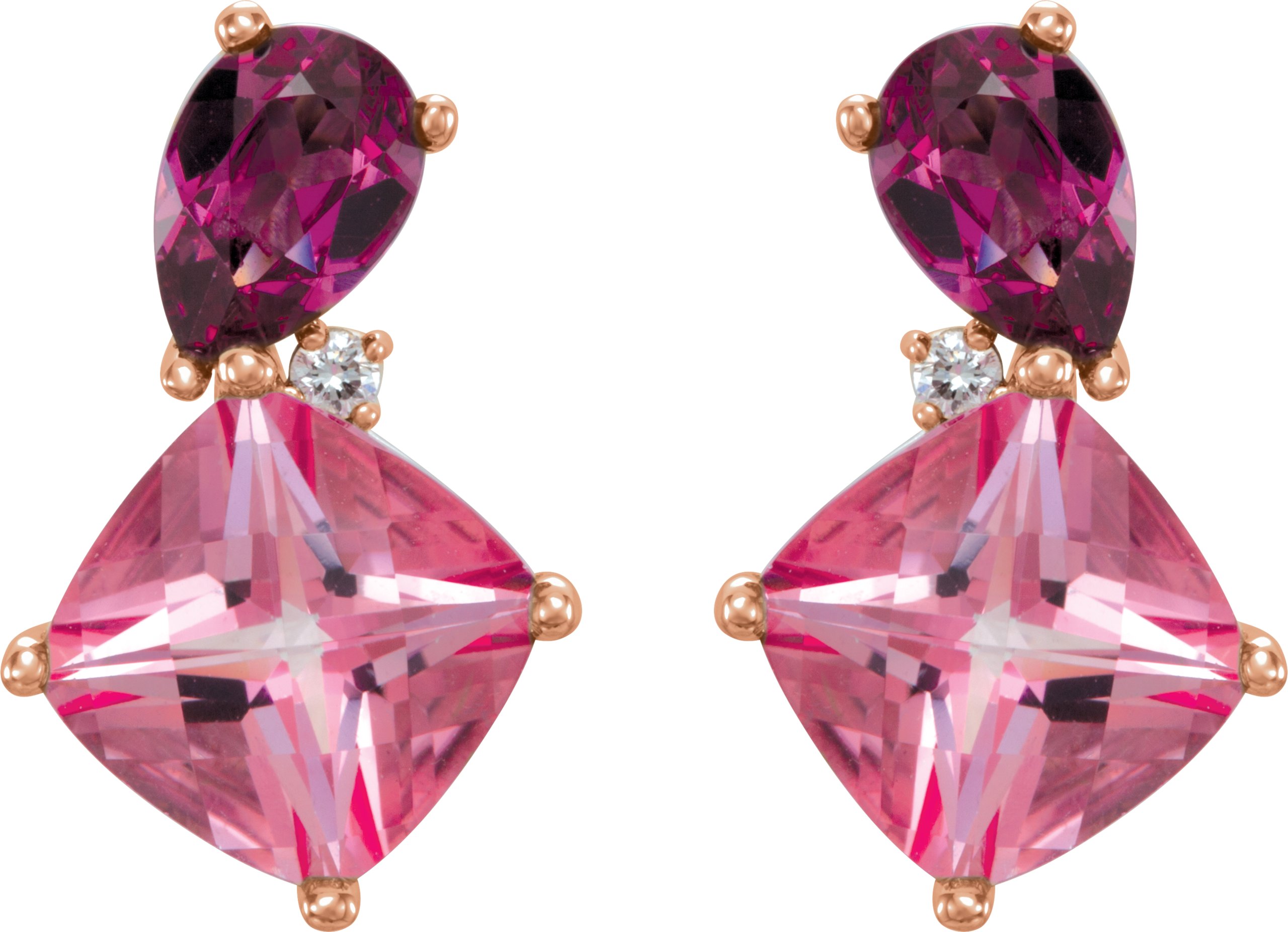 Description: Gen Baby Pink Topaz, Rhodolite Garnet And .03CTW Diamond Earrings With Backs