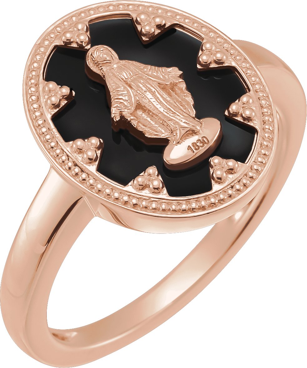 14K Rose Oval Black Enamel Miraculous Medal Ring