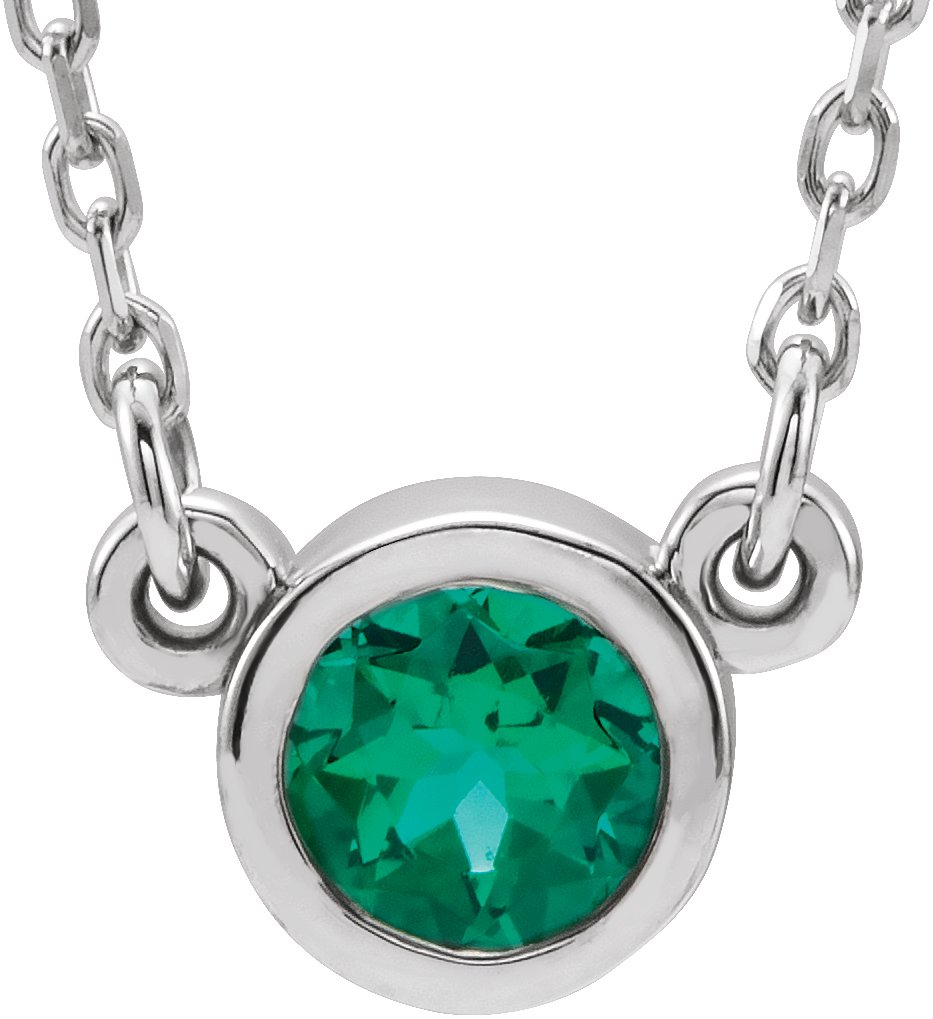 14K White 3 mm Round Chatham Lab Created Emerald Bezel Set Solitaire 16" Necklace Ref. 14244511