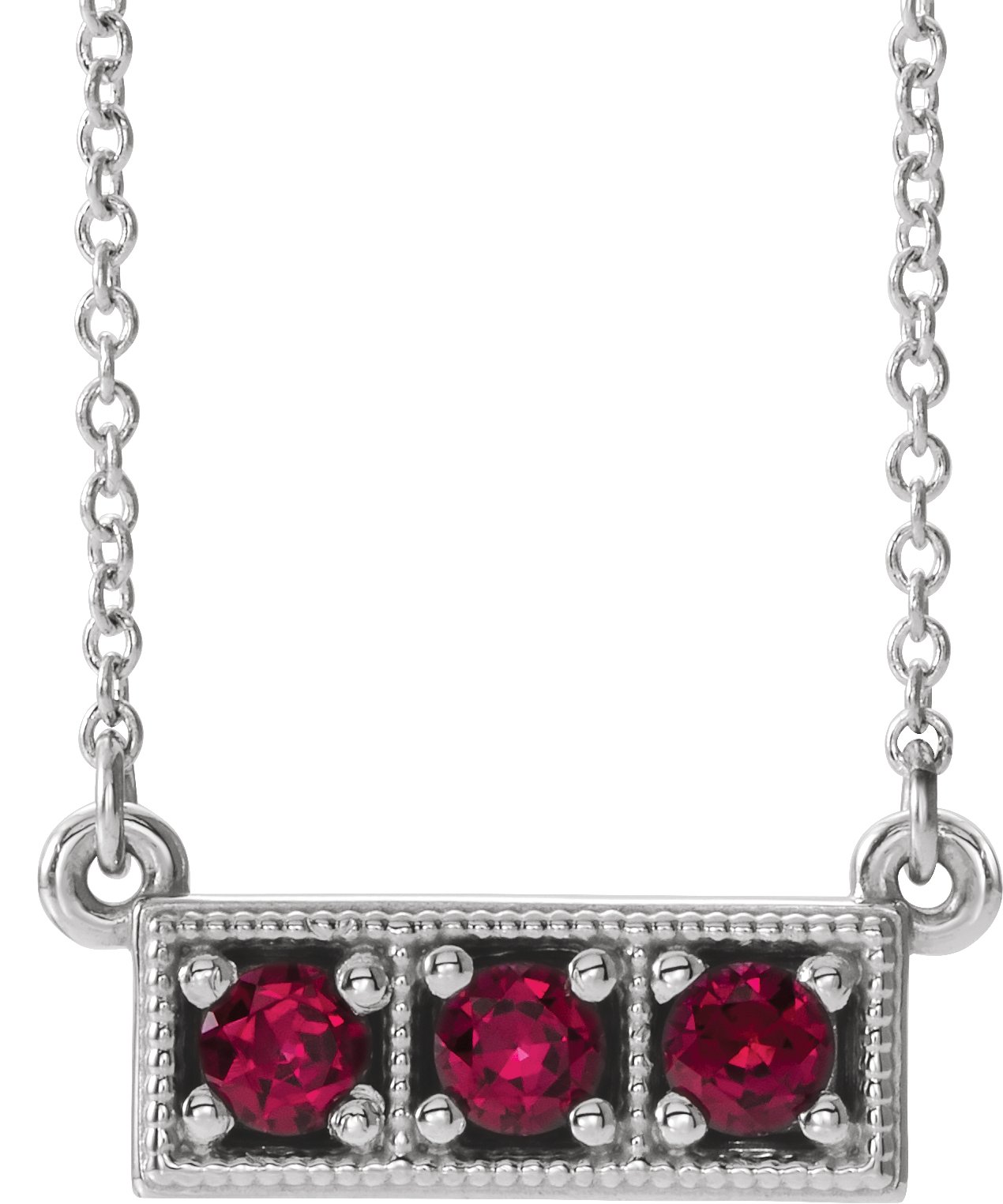 14K White Chatham Created Ruby Three Stone Granulated Bar 16 18" Necklace Ref. 14204250