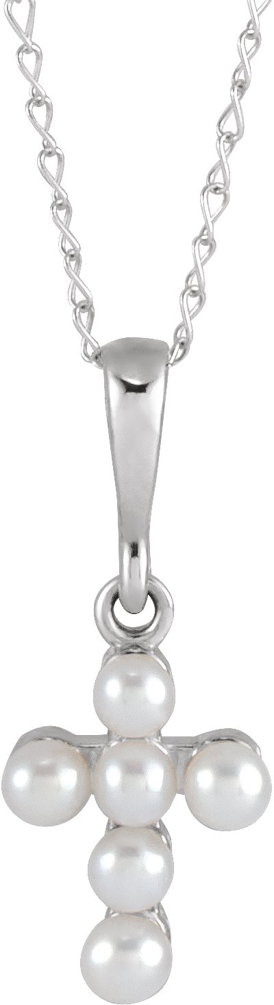 14K White Cultured White Seed Pearl Youth Cross 16" Necklace