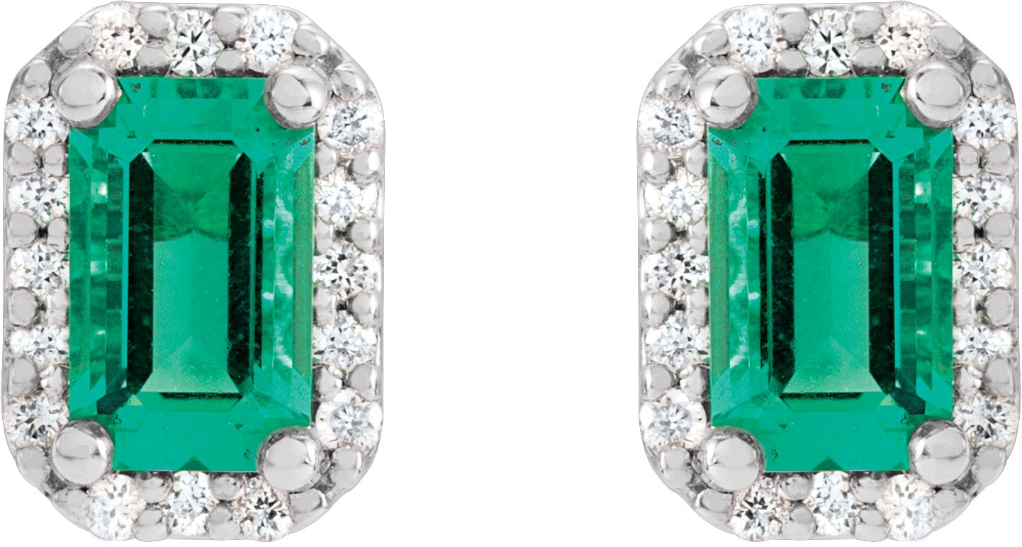 14K White Lab-Grown Emerald & 1/6 CTW Natural Diamond Halo-Style Earrings