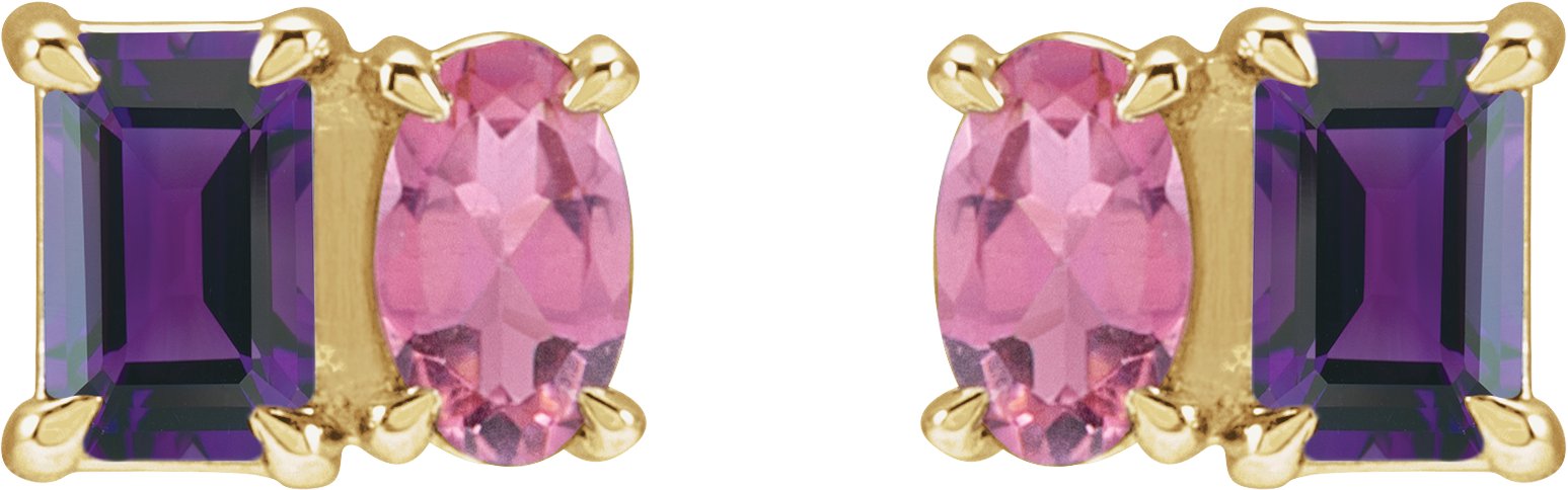 14K Yellow Natural Amethyst & Natural Pink Tourmaline Two-Stone Stud Earrings