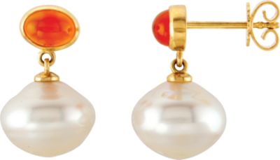 7x5mm Carnelian & 11mm South Sea Cultured Pearl Earrings.