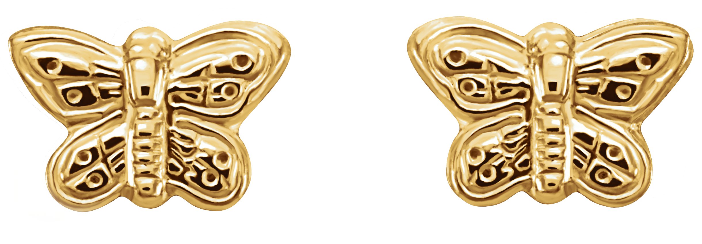 Children's Butterfly Earrings | 4.5 x 6.5 mm. Standard post. Comes with its own pad, box, tote bag and signature card. 14K Yellow Gold.