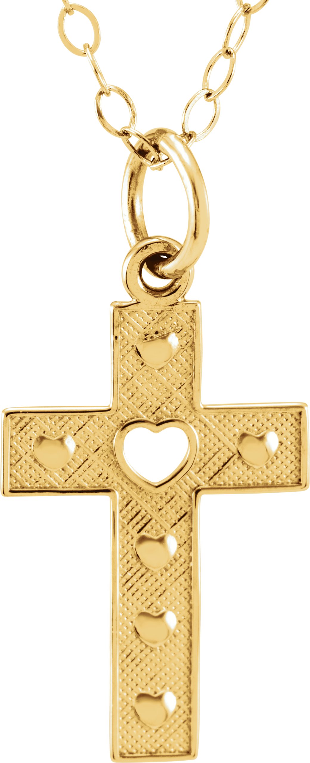 Children's Cross with Heart Pendant | 14.5 x 9 mm. Comes with 15" cable chain.