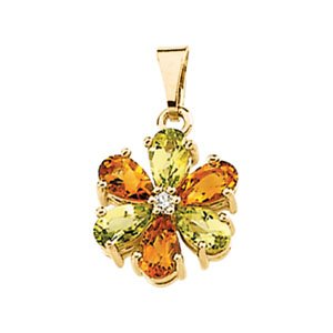 Genuine Peridot Genuine Citrine And Diamond Pendant | 5 x 3 mm | .02 Carat TW; Flower design features genuine peridot and citrine gemstones with a diamond center; Matching Earrings: 65280.