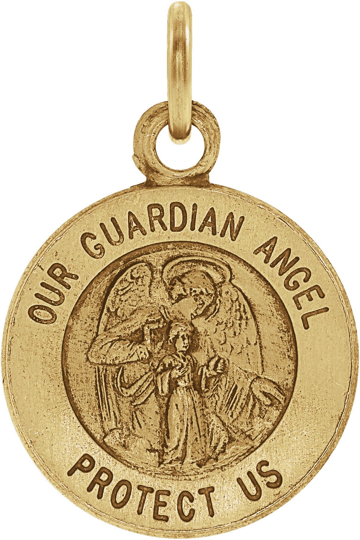 Guardian Angel Medal. Available in 14K Yellow gold 15 mm or 18 mm diameter.