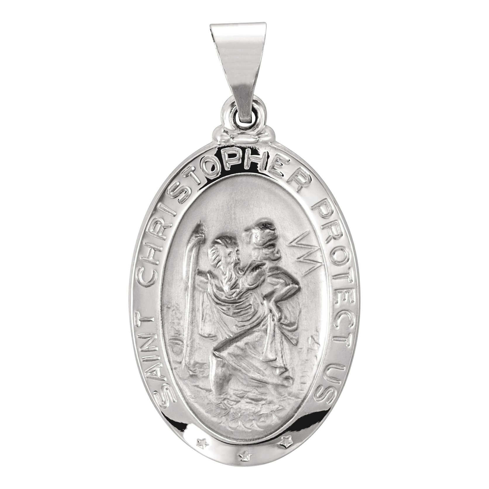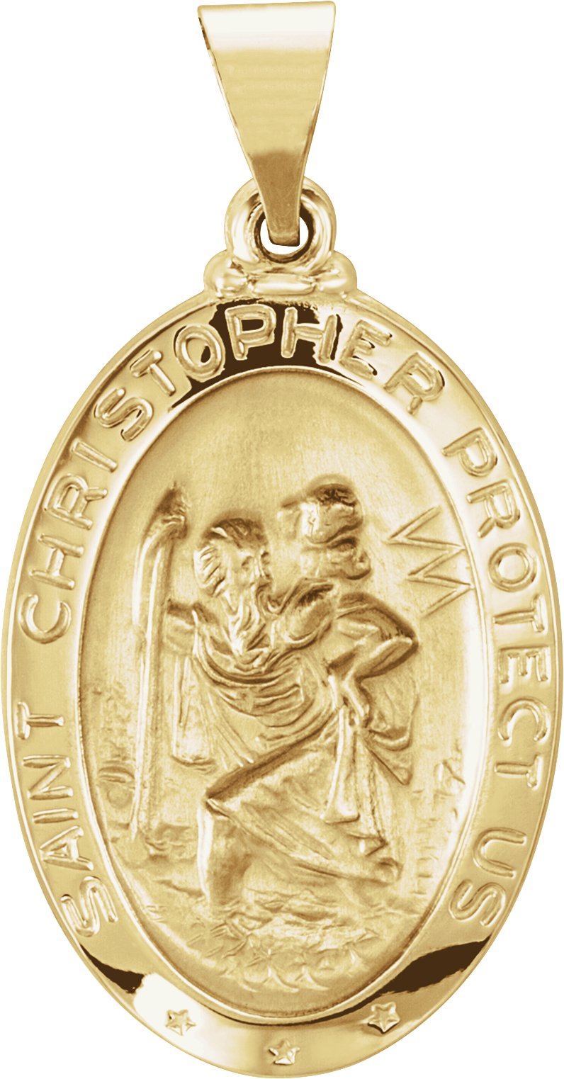 Hollow Oval St. Christopher Medal | 23.5 x 16 mm. St. Christopher is the patron saint of athletes, porters, sailors and travelers. Available in 14K Yellow or 14K White Gold.