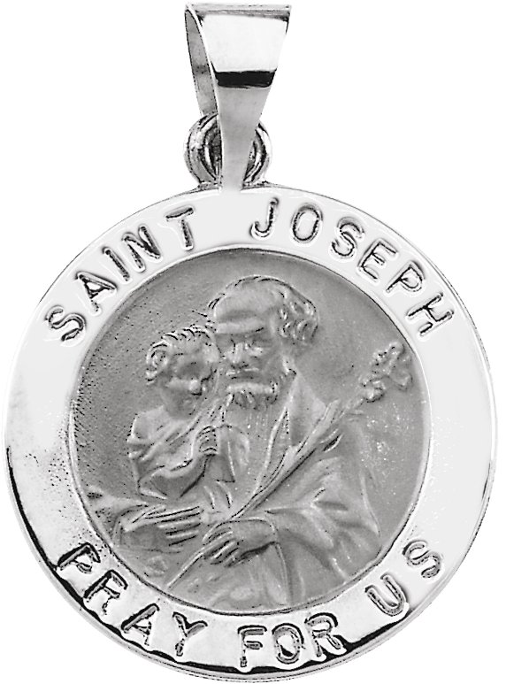 Hollow Round St. Joseph Medal | 18.25 mm. St. Joseph is the patron saint of carpenters, workers, the dying, universal church, China and Peru. Available in 14K Yellow or 14K White Gold.