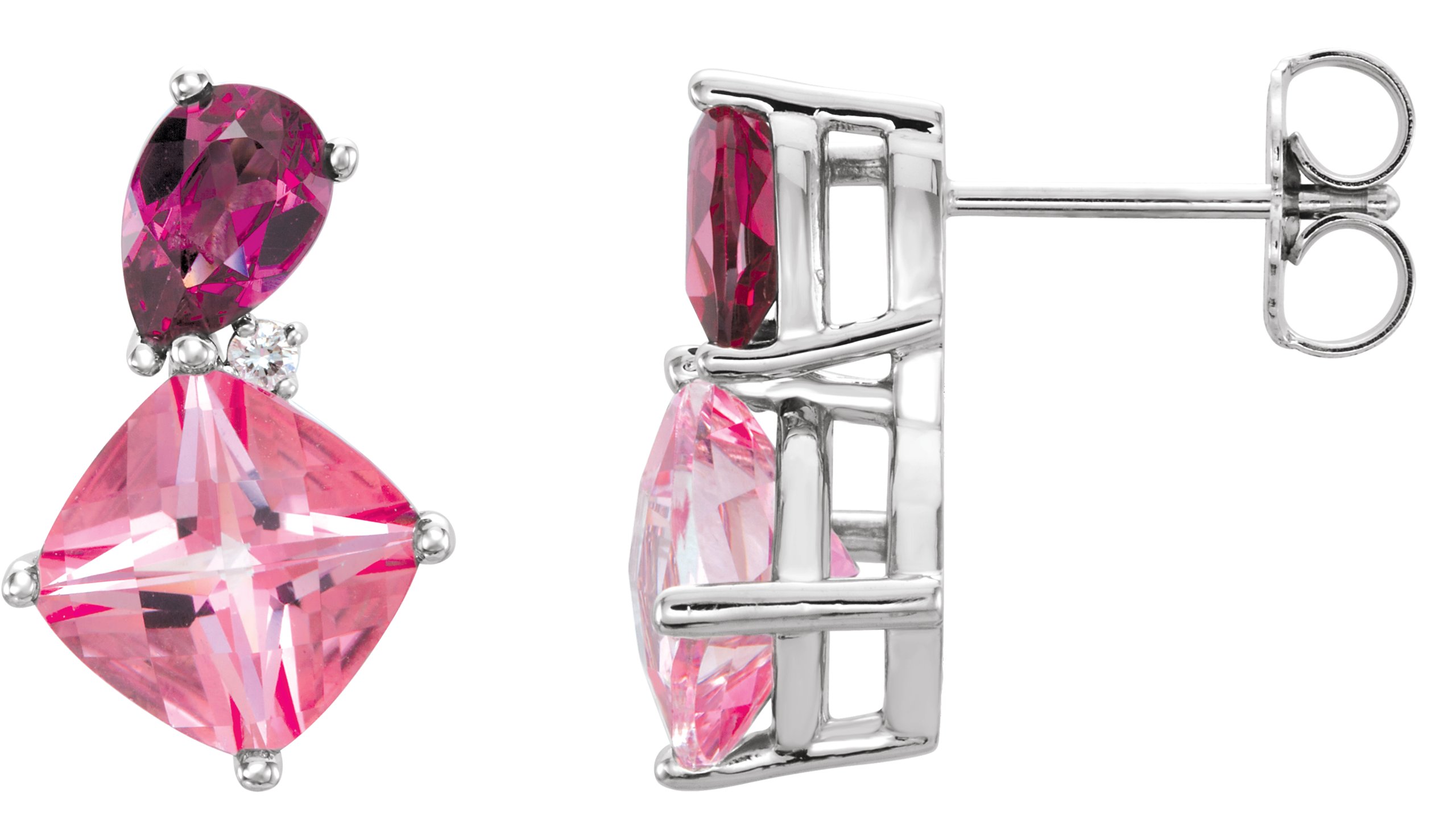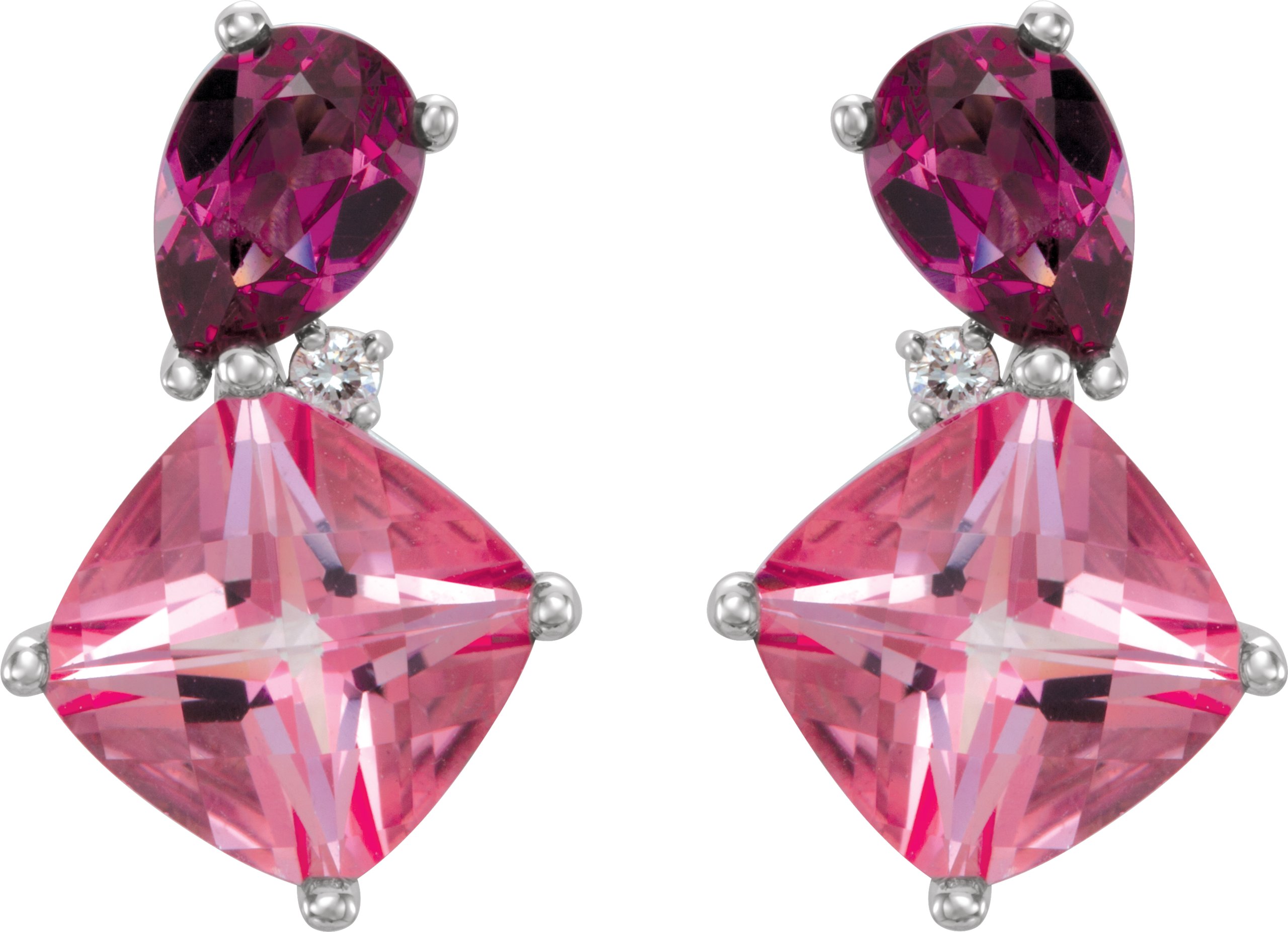 Description: Gen Baby Pink Topaz, Rhodolite Garnet And .03CTW Diamond Earrings With Backs