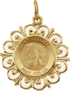 St. Francis of Assisi Medal | 18.5 mm. 14K Yellow Gold. St. Francis of Assisi is the patron saint of animals, ecologists, merchants, catholic action and Italy.