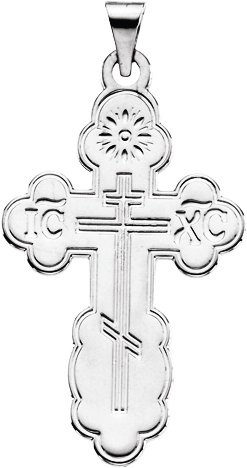 This cross is worn by Eastern Orthodox Christians including Greek, Russian and Lebanese. In addition to the slanted footrest, it features the "IC" and "XC", which are shorthand in Greek for Jesus Christ. The "IC" is the first and last letter of ISOUS; the squiggly line indicating that this is an abbreviation. The "XC" is the first and last letter of CHRISTOS. Available in Sterling Silver, 14K Yellow Gold or 14K White Gold. Ref. R4062.