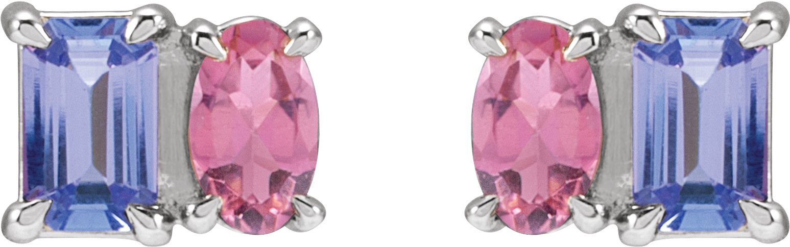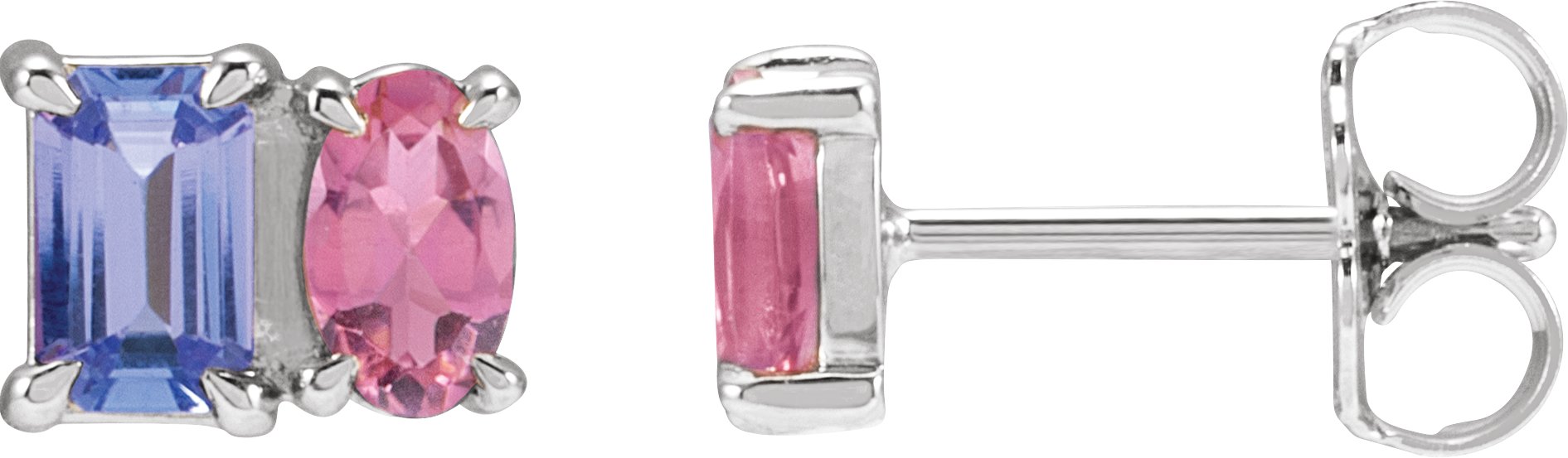 Sterling Silver Natural Tanzanite & Natural Pink Tourmaline Two-Stone Stud Earrings